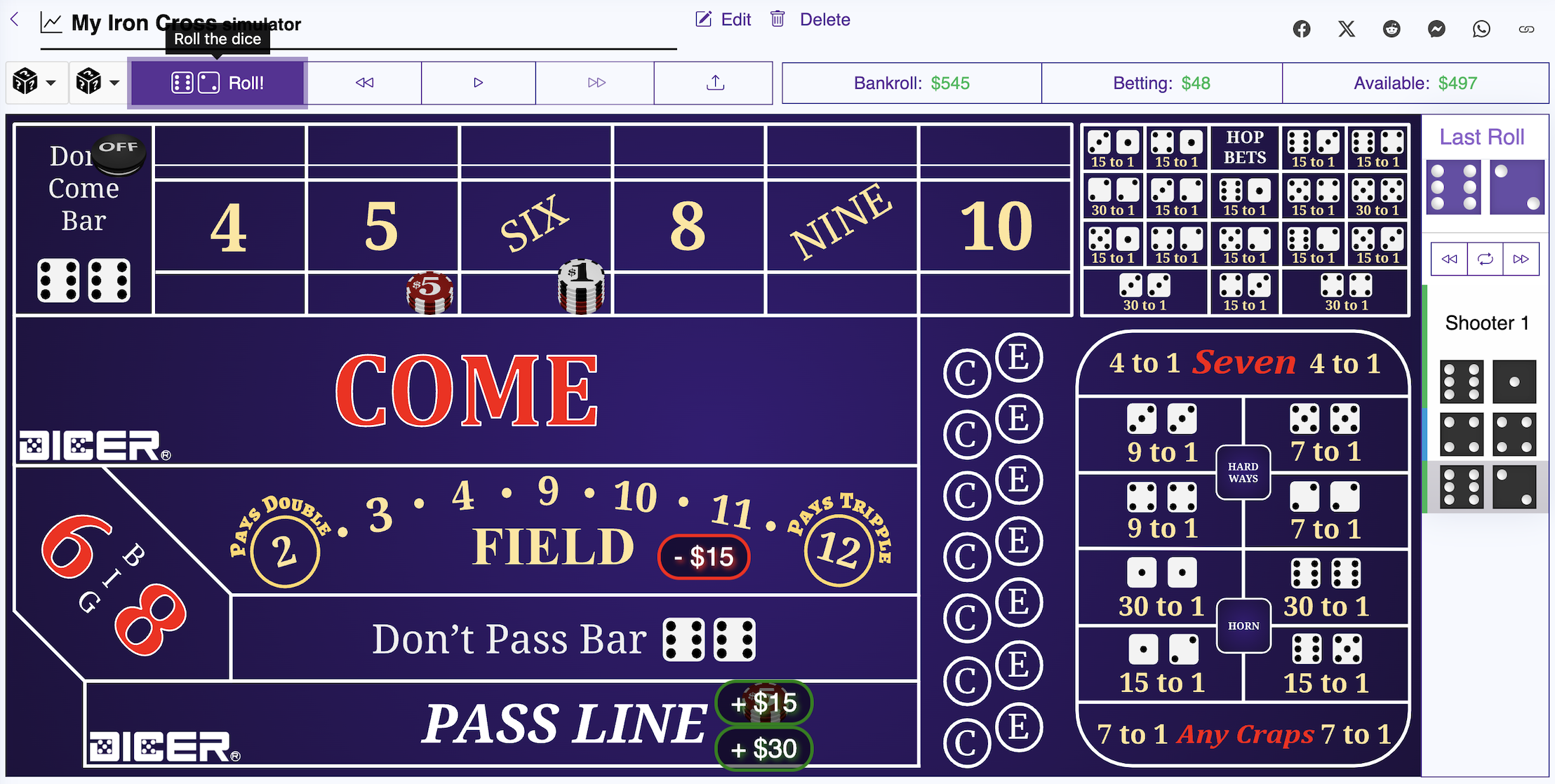 - Auto-roll to rapidly simulate rolls. Change speed, number of shooters, and the table minimum.