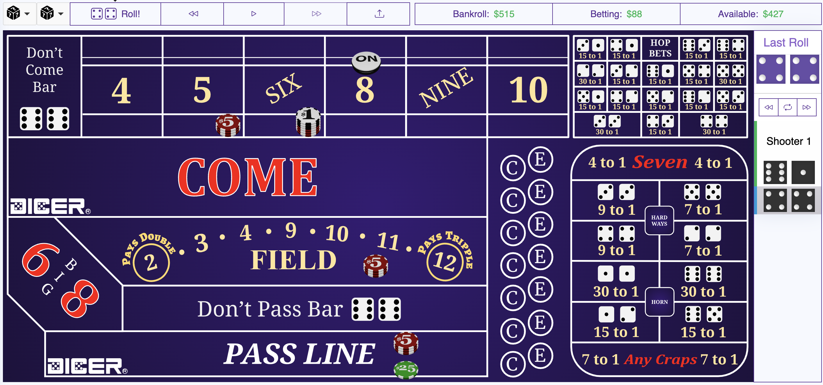With the Dicer craps strategy builder, you can quickly build and simulate your favorite Craps strategies.